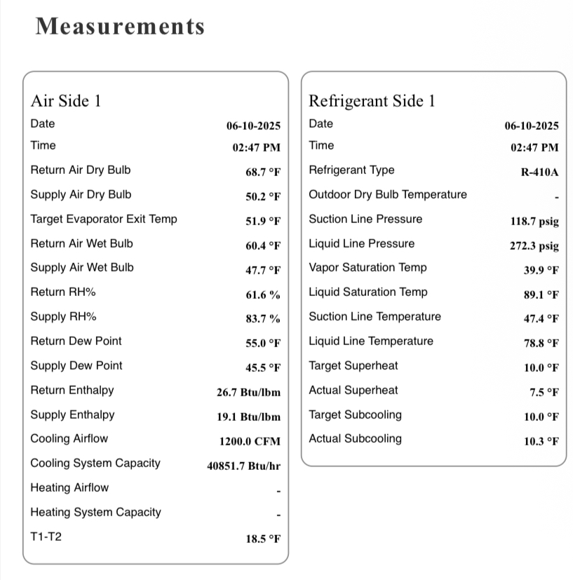 Performed heating maintenance on a 2022 Daikin Fit 17SEER heat pump system Replaced Honeywell 20x25x4 filter with one we provide with the gold maintenance plan Tested aprilaire 600 humidifier Water panel in good shape, operating normally, no water leaks at this time Tested NuCalgon iWave ionizer, self test was successful Blower is in OK condition Inspected auxiliary heat kit for overheated wiring All connections are in good shape Run tested heating Witnessed system perform defrost successfully After ten minutes of run time, temperature rise was 30⁰, vapor line 141⁰, BTU capacity calculat4d to 42000btu No concerns found