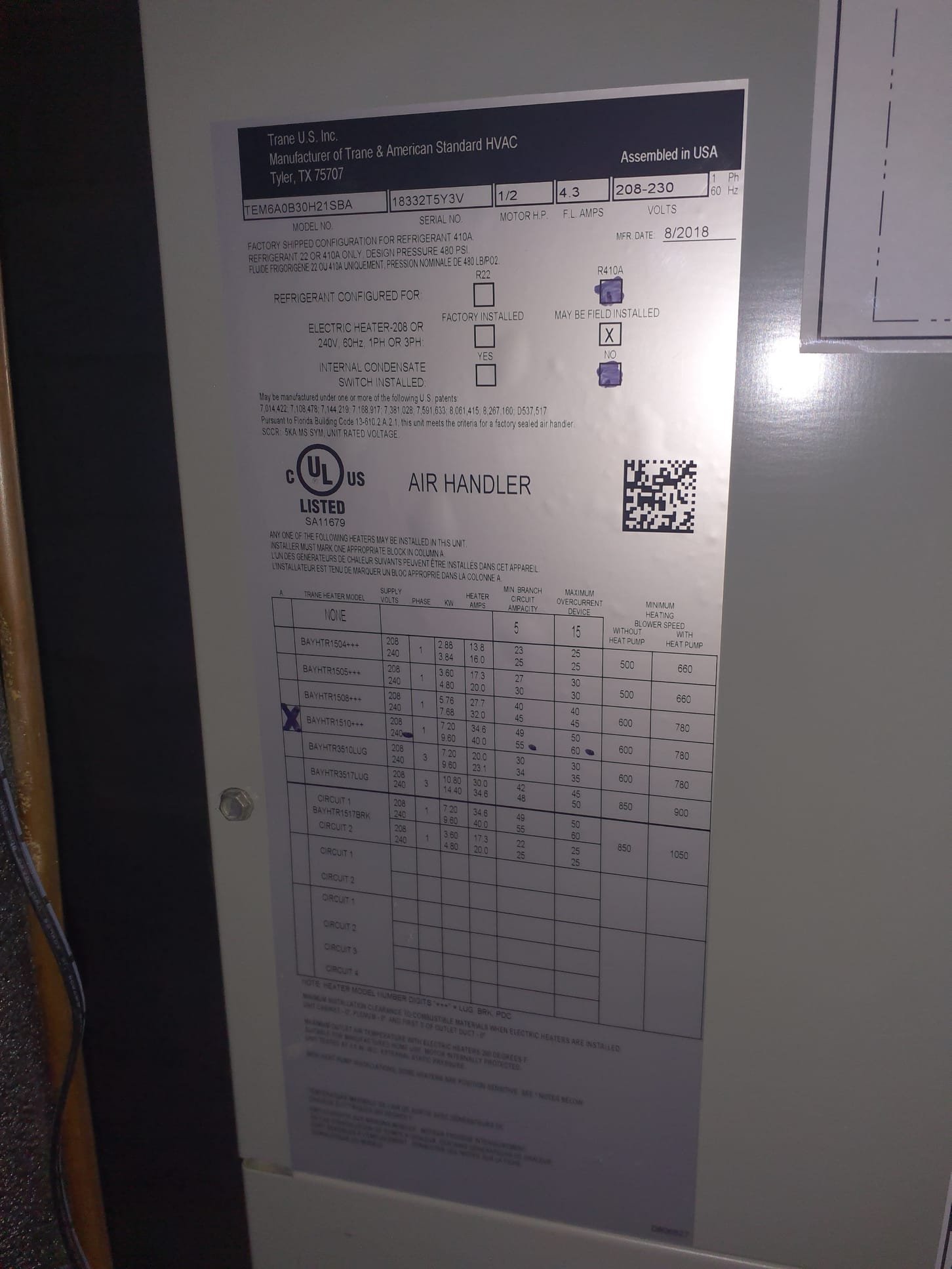 Preventative maintenence inspection on 2018 Trane air handler with electric heat strips kit. Checked for any loose wiring and resistance on heat strips. All are good. Test ran operation of electric heat strips. All strips are operating within Amp draw specifications. Blower motor is operating within specs. Humidifier pad in new condition. Opened damper and test ran during heating test. All systems are operating properly, efficiently and ready for Winter.